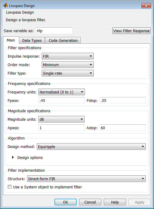 Введите filterDesigner в командной строке MATLAB ®. В конструкторе фильтров отображается исходное диалоговое окно.