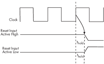Время удержания - это время, в течение которого испытательный стенд удерживает входные сигналы сброса за фронтом нарастания тактового сигнала. На рисунке показано применение времени удержания (thold) для сброса входных сигналов в активном высоком и активном низких случаях. Испытательный стенд устанавливает сброс после некоторых начальных тактовых циклов, определенных опцией Reset length. По умолчанию отображается значение Reset length, равное 2 тактам.