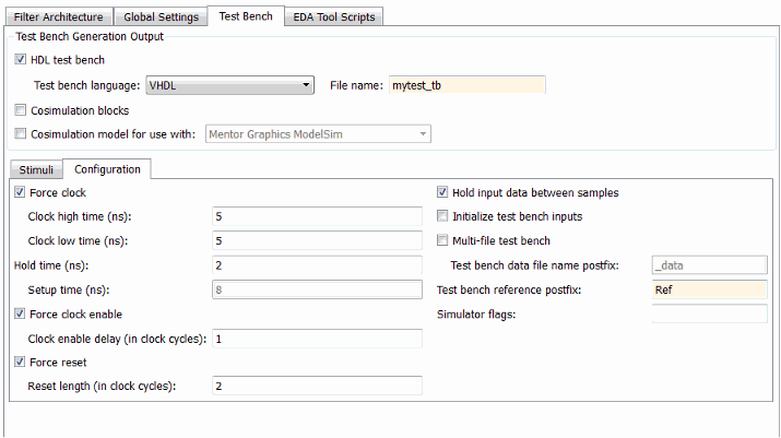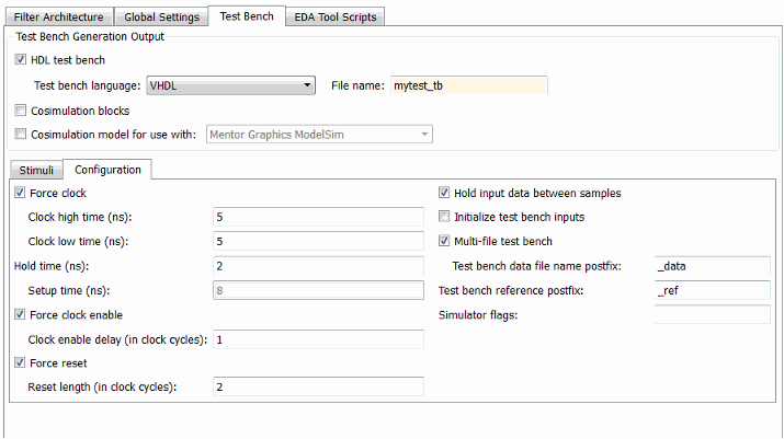 Например, если тестовый стенд имеет имя my_fir_filt, а целевым языком является VHDL, имена файлов тестового стенда по умолчанию: