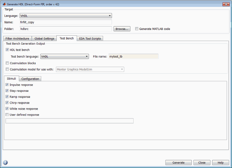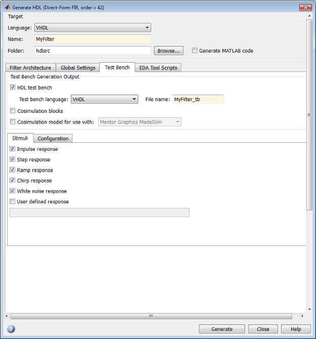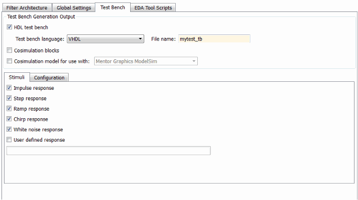 По умолчанию кодер генерирует тестовый стенд фильтра, который включает в себя стимулы, соответствующие данному типу фильтра. Однако при необходимости можно настроить настройки стимулов или указать пользовательские стимулы.