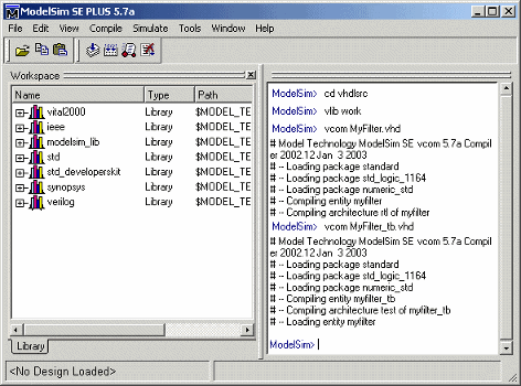 Следующая последовательность команд Mentor Graphics ModelSim изменяет текущую папку на hdlsrc, создает библиотеку проектирования workи компилирует код тестового стенда VHDL и фильтра. vlib создает работу библиотеки проекта и vcom команды инициируют компиляцию.