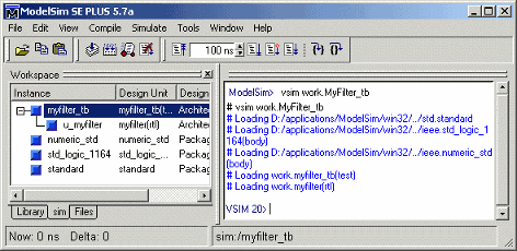 После создания фильтра и тестового стенда файлов HDL запустите симулятор. При запуске симулятора Mentor Graphics ® ModelSim ® появляется экран, подобный следующему :