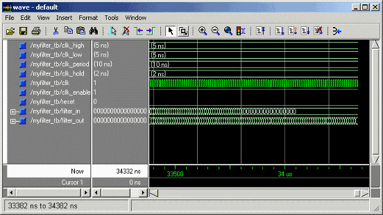 На следующем экране показаны результаты загрузки work.MyFilter_tb с vsim команда.