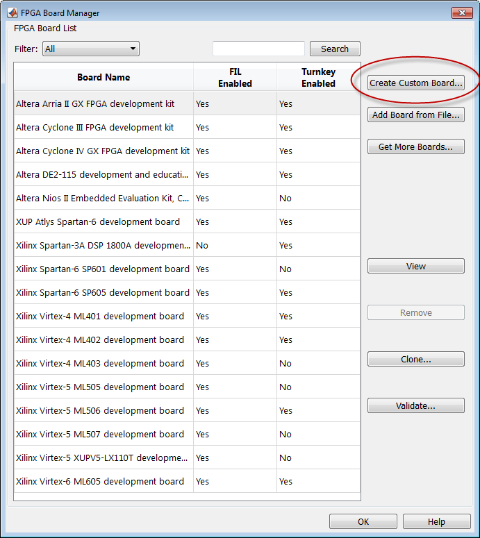 Для FPGA-in-the-loop можно использовать собственную сертифицированную плату FPGA, даже если она отсутствует в списке предварительно зарегистрированных плат FPGA, поставляемых MathWorks ®. С помощью мастера создания платы FPGA можно создать файл определения платы, описывающий пользовательскую плату FPGA.
