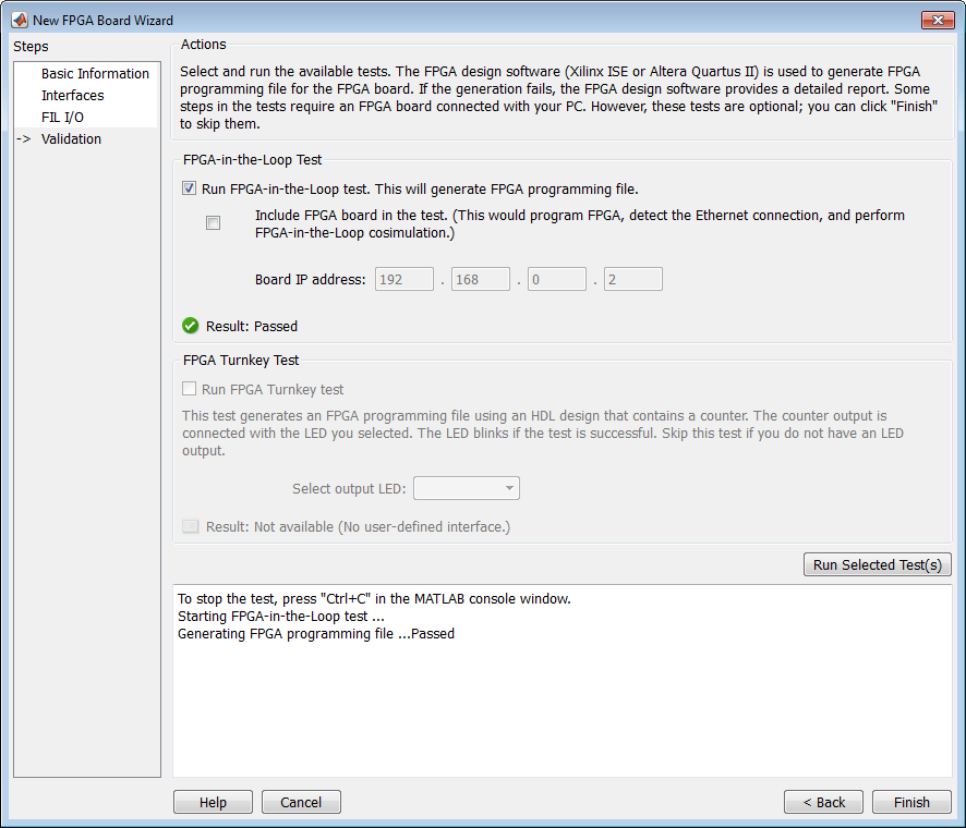 Если плата подключена, установите флажок Include FPGA в опции test (Включить плату FPGA). Необходимо указать IP-адрес платы FPGA. В этом примере предполагается, что плата Xilinx KC705 подключена к компьютеру и имеет IP-адрес 192.168.0.2.