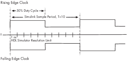 На следующем рисунке показана временная диаграмма, которая включает в себя часы подъема и снижения фронта с временем выборки Simulink, равным T=10 и предел разрешения имитатора ЛПВП, равный 1 нс. Рисунок также показывает, что, учитывая эти параметры синхронизации, тактовый цикл составляет 50%.