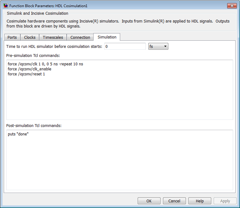 Выберите вкладку «Часы» в диалоговом окне «Параметры блока». Simulink отображает диалоговое окно, как показано на следующем рисунке (пример показан для использования с Incisive).