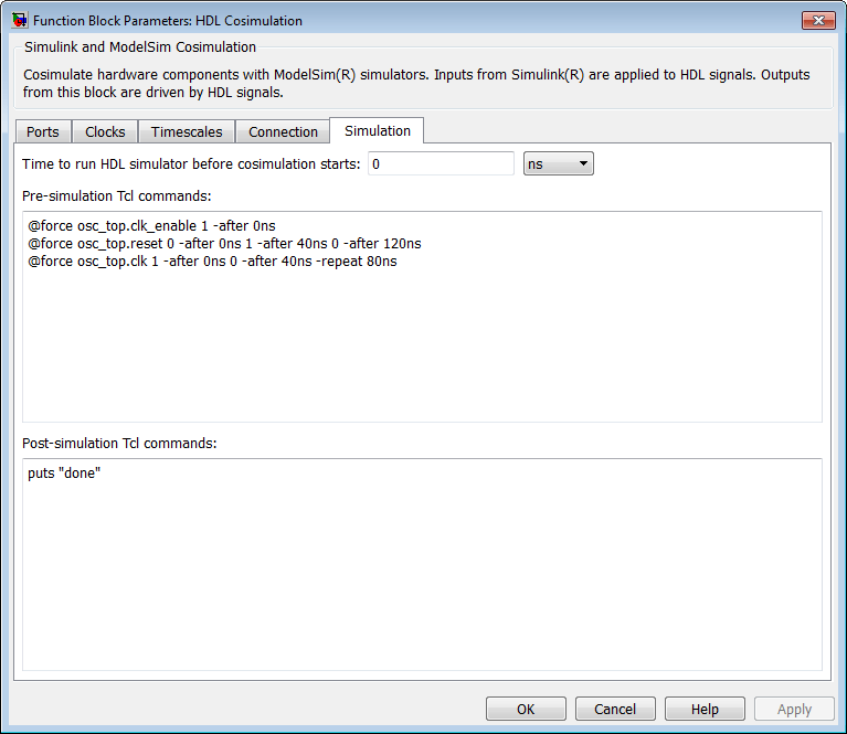 Ниже приведен пример ввода команд силы на панели Моделирование (Simulation) блока косимуляции HDL для использования с ModelSim.