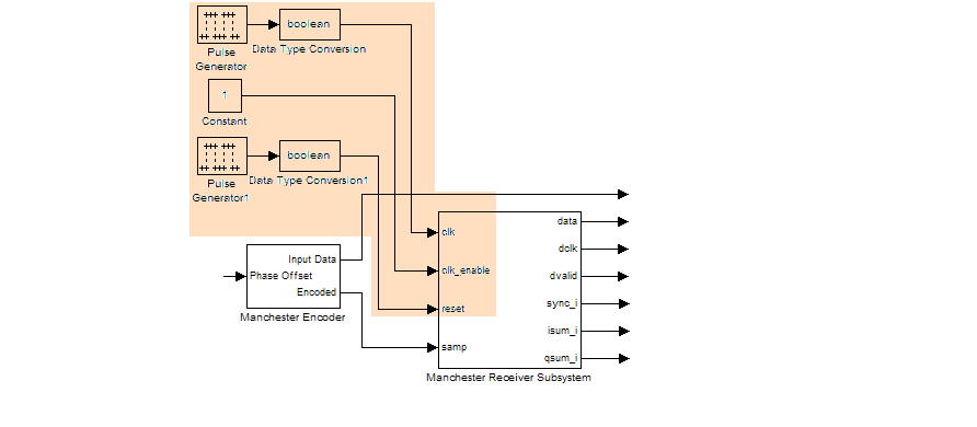 На следующем примере в затененной области показаны тактовый сигнал, сигнал сброса и сигнал включения тактового сигнала в качестве входных данных для модели блока косимуляции с несколькими ЛПВП. Эти сигналы создаются с использованием двух блоков преобразования типа данных Simulink и блока постоянного источника, которые соединяются с блоком Cosimulation HDL с меткой «Manchester Receiver Subsystem».