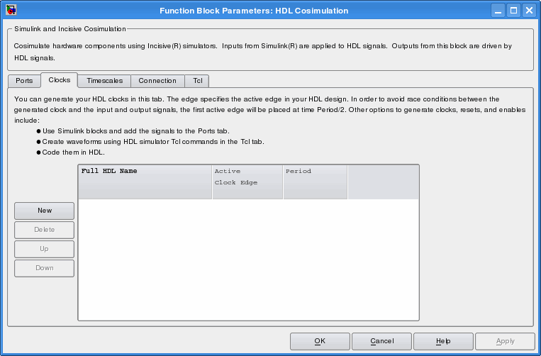 Следующее диалоговое окно определяет восходящие синхросигналы clk для блока Cosimulation HDL с периодом по умолчанию 2 (пример показан для использования с Incisive).