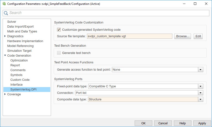 Если у вас есть лицензия на Embedded Coder ®, вы можете выбрать целевойsystemverilog_dpi_ert.tlc. Этот целевой объект позволяет получить доступ к дополнительным опциям создания кода (на панели Создание кода (Code Generation) в окне Параметры конфигурации модели (Model Configuration Parameters)).