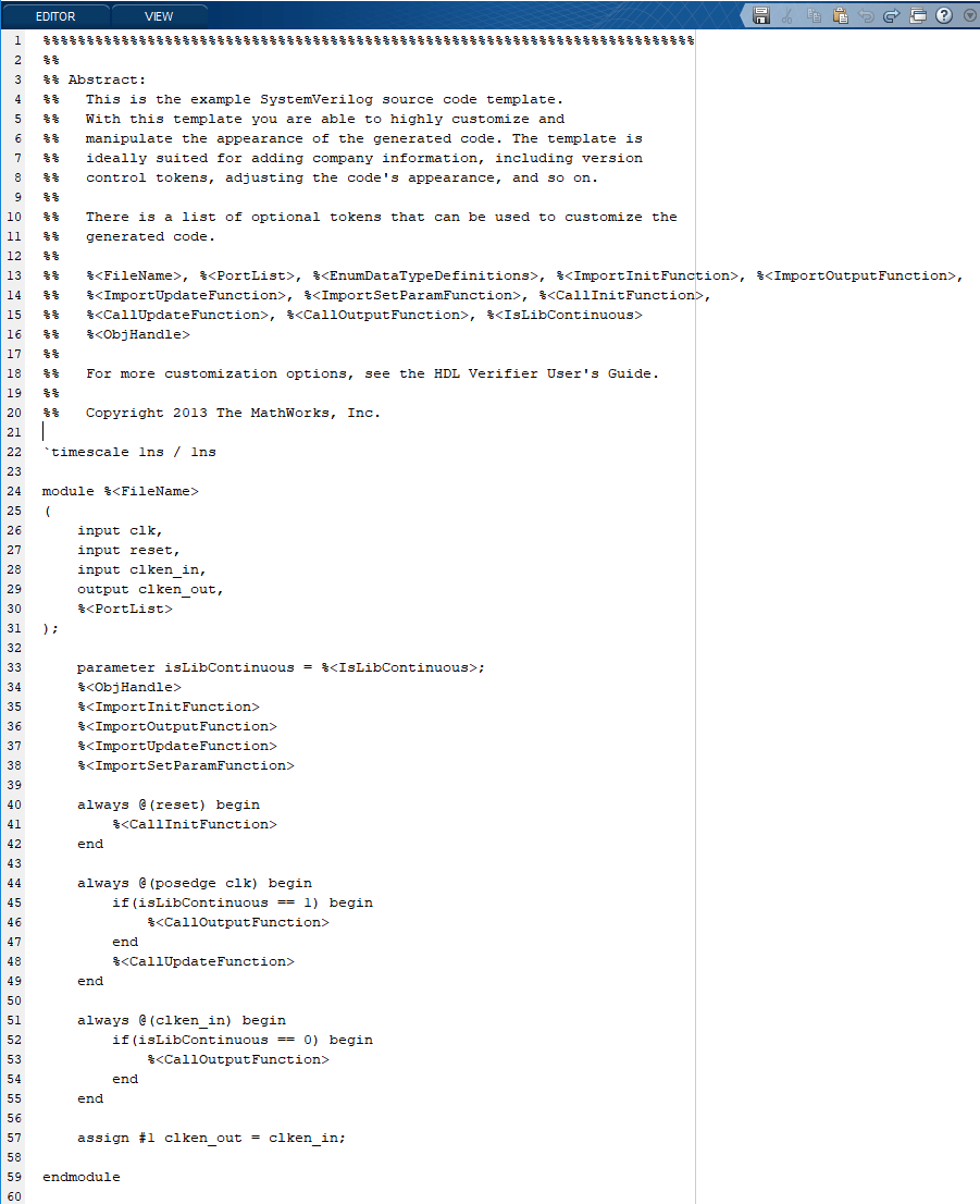 Выберите Изменить, чтобы просмотреть содержимое указанного шаблона исходного файла. В этом примере показано содержимое файла шаблона, поставляемого с HDL Verifier™, svdpi_grt_template.vgt: