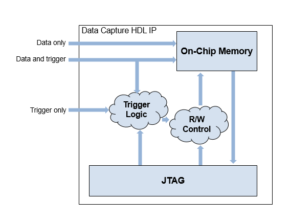 IP-ядро захвата данных FPGA взаимодействует по кабелю JTAG между платой FPGA и хост-компьютером. Убедитесь, что кабель подключен. Перед захватом данных можно задать типы данных для захваченных данных и условия триггера, определяющие время сбора данных. Для настройки этих параметров и сбора данных можно: