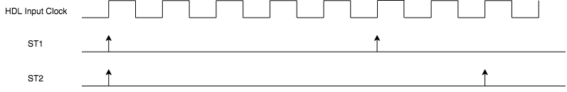 ST1=0.5, ST2=0.7. Компонент DPI работает во время выборки 0,1 (поскольку 0,1 является наибольшим общим делителем 0,5 и 0,7). Для успешного получения сигнала с временем выборки 0,5 (ST1) или 0,7 (ST2) тактовый сигнал HDL должен переключаться пять или семь раз соответственно.