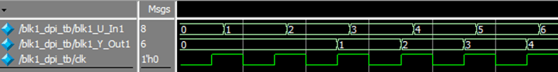 Сгенерированный код C сохраняет это поведение, и выходной сигнал содержит задержанную версию входного сигнала с одной выборкой. Однако в файле оболочки SystemVerilog тактовый сигнал используется для синхронизации входного и выходного сигналов:
