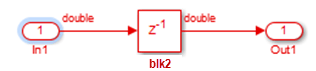 По сравнению с исходной моделью Simulink созданный модуль SystemVerilog вводит на выходе одну дополнительную задержку выборки. Например, в следующей модели Simulink выходной сигнал представляет собой задержанную версию входного сигнала с одной выборкой.