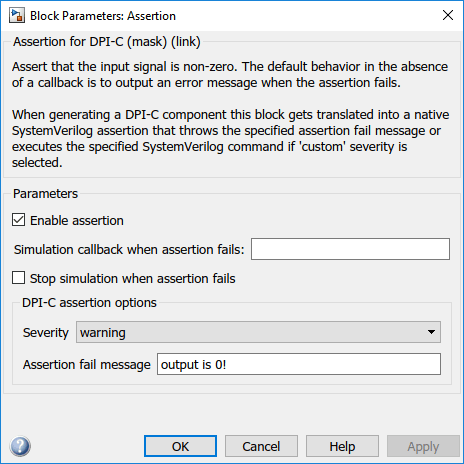 Раздел «Параметры» управляет выполнением Simulink, и они идентичны параметрам в блоке Simulink Assertion (Simulink). Параметры утверждения DPI-C управляют поведением утверждения только в созданном SystemVerilog.