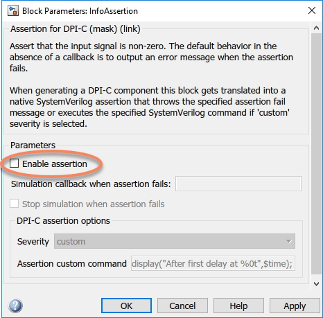 Отключение утверждений в Simulink. Чтобы отключить проверку входного сигнала блока утверждения DPI-C или выдачу предупреждений или ошибок, снимите флажок Включить утверждение в параметрах блока утверждения.