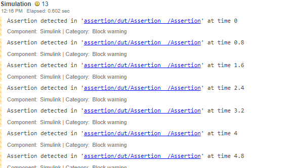 Каждое предупреждение отображает номер, идентифицирующий конкретный блок утверждения, который создал это предупреждение. Это число является идентификатором Simulink (SID) этого блока. Например, ниже показано предупреждение, генерируемое блоком утверждения с номером SID 14.