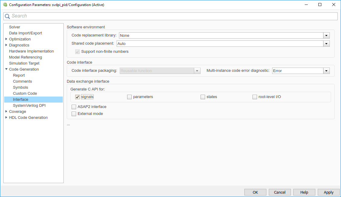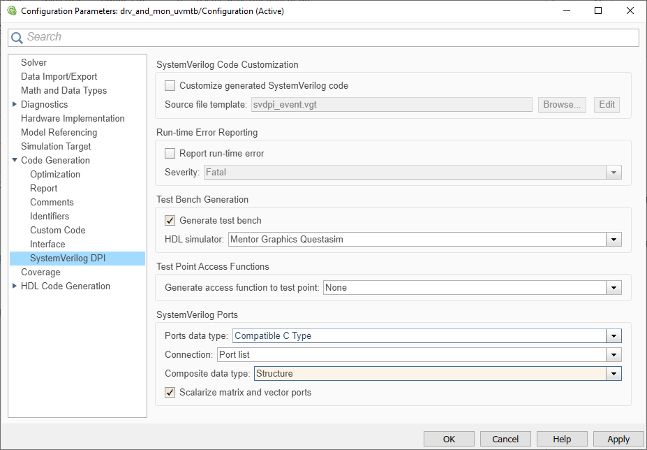 Кроме того, при наличии лицензии Embedded Coder ® можно выбрать целевойsystemverilog_dpi_ert.tlc. Этот целевой объект позволяет получить доступ к дополнительным опциям создания кода на панели Создание кода (Code Generation) диалогового окна Параметры конфигурации модели (Model Configuration Parameters).