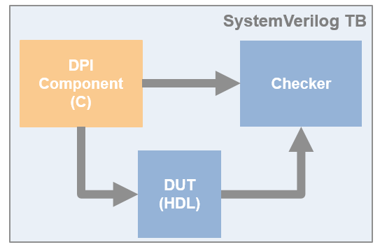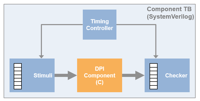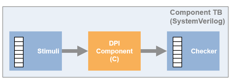 HDL Verifier™ предоставляет два типа тестовых стендов, которые генерируют компонент языка C и интегрируют его в тестовый стенд SystemVerilog с прямым интерфейсом программирования (DPI). Один стенд проверяет сформированный компонент C на соответствие сохраненным векторам данных из подсистемы Simulink ®. Другой стенд проверяет сгенерированный код HDL на соответствие компоненту C, сгенерированному из всей модели Simulink.