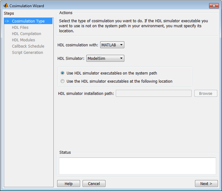 Выберите Использовать исполняемые файлы имитатора HDL в системном пути, если в нем находятся файлы. Мастер косимуляции по умолчанию предполагает, что они находятся в системном пути.
