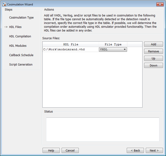 По возможности Мастер Cosimulation Wizard автоматически определит порядок компиляции с помощью функции имитатора HDL. Это означает, что файлы можно добавлять в любом порядке.