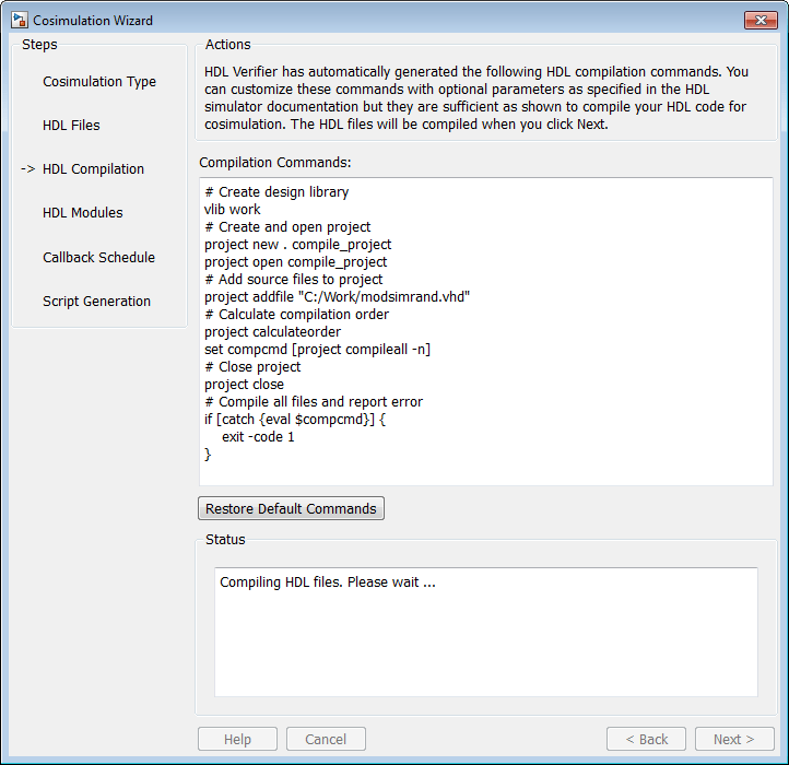 Щелкните Восстановить команды по умолчанию (Restore default commands), чтобы вернуться к созданным командам компиляции HDL. Вам предлагается подтвердить, что вы хотите отменить любые изменения.