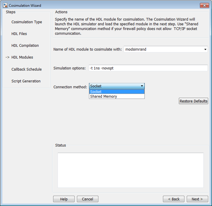 Введите имя модуля в поле Name of HDL module to cosimulate with.