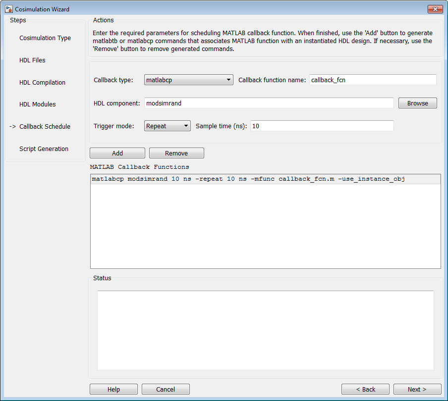 Имя функции обратного вызова (необязательно): укажите имя компонента или функции тестового стенда, если оно не совпадает с именем компонента HDL. По умолчанию предполагается, что имя функции совпадает с именем компонента HDL.
