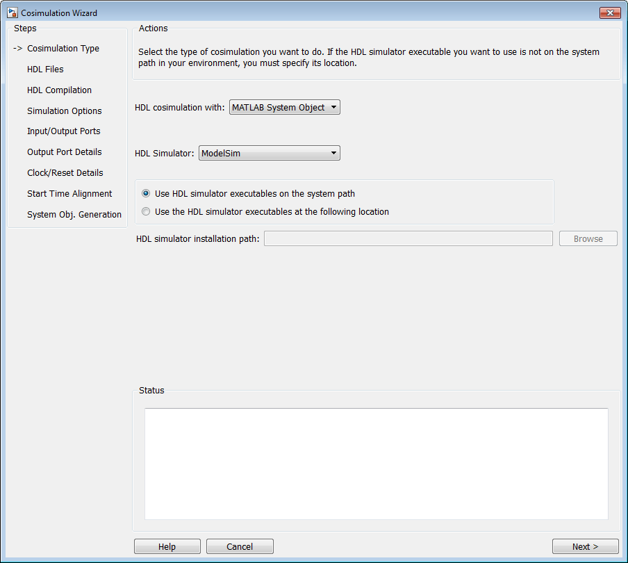 Выберите Использовать исполняемые файлы имитатора HDL в системном пути, если в нем находятся файлы. Мастер косимуляции по умолчанию предполагает, что они находятся в системном пути.