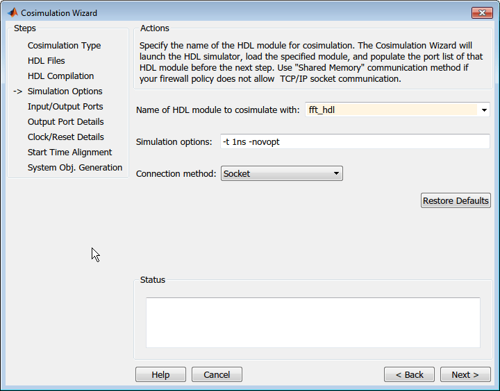 Введите имя модуля в поле Name of HDL module to cosimulate with.