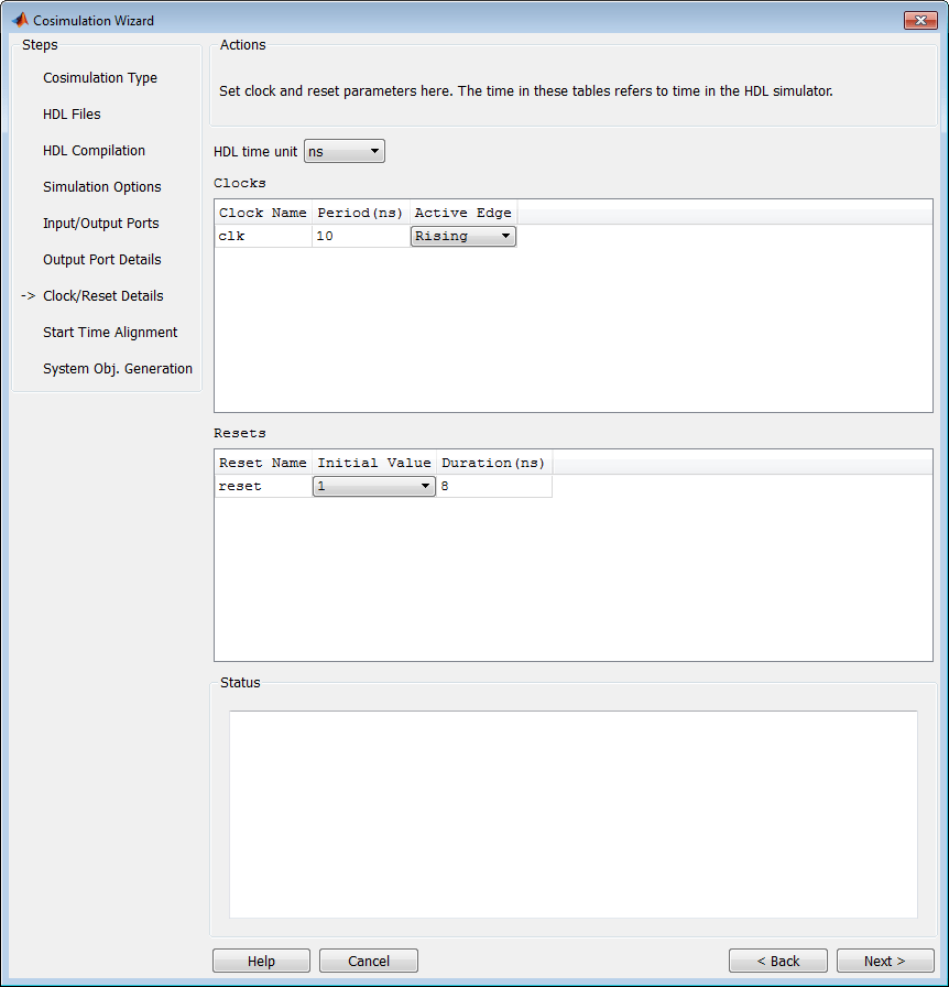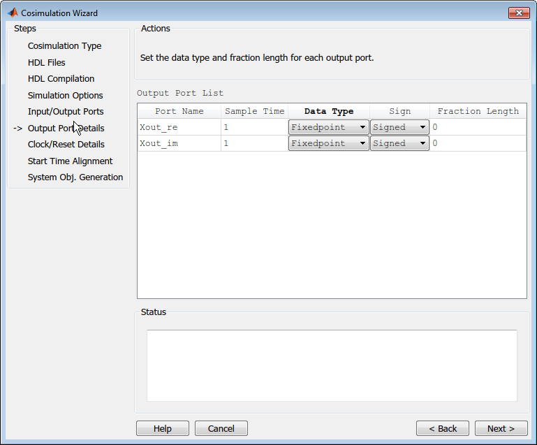Время выборки по умолчанию - 1, тип данных по умолчанию: Inherit и Signed. Эти значения по умолчанию согласуются с тем, как маска блока косимуляции HDL (вкладка «Порты») устанавливает настройки по умолчанию для портов вывода (workflow-процесс Simulink ®).