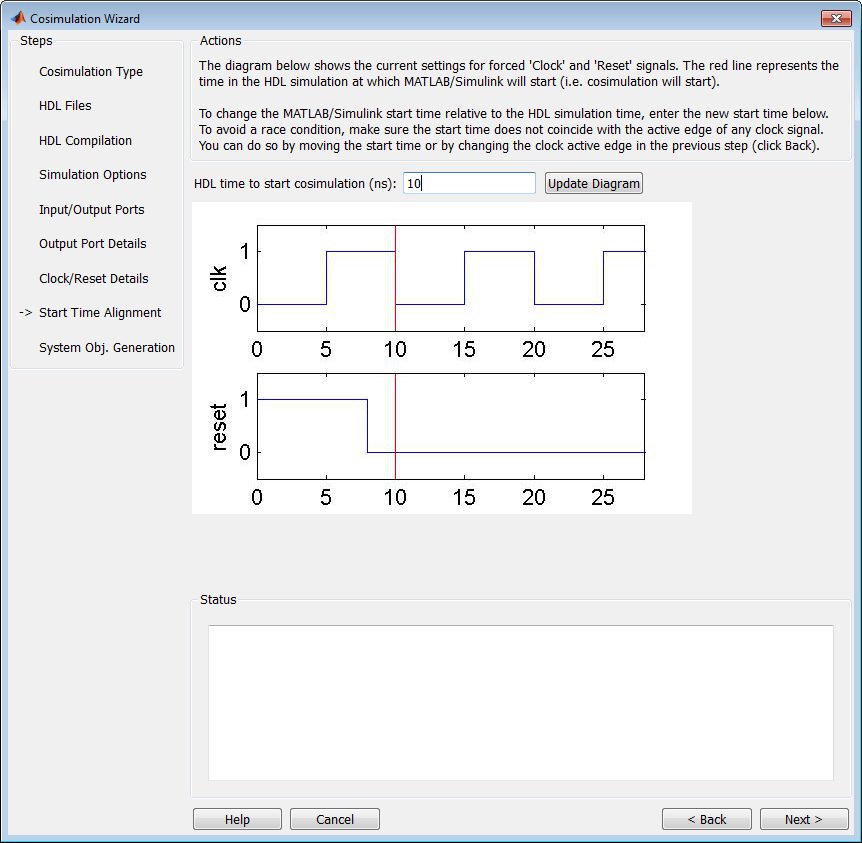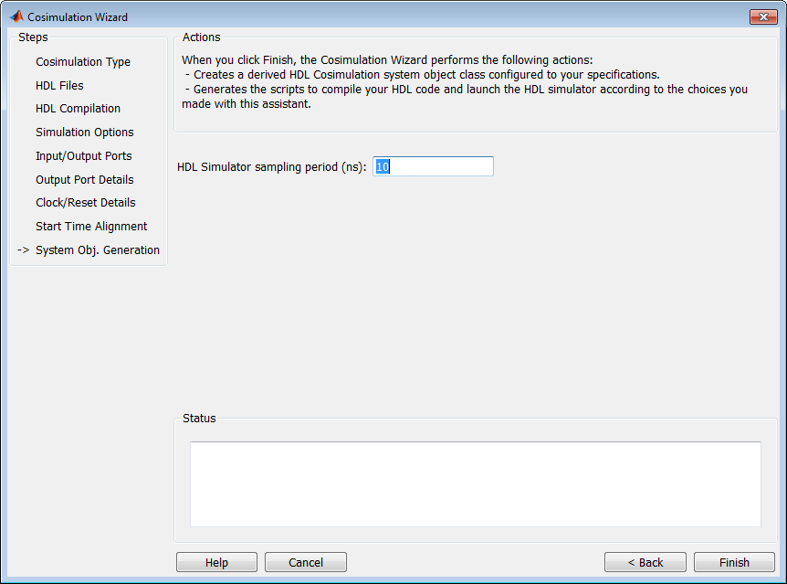 Период выборки имитатора HDL можно изменить до того, как мастер создаст системный object™. Введите новое значение в поле «Период выборки имитатора HDL (ns)».