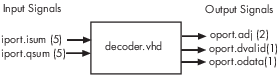 Оба входных порта определяются как векторы, состоящие из пяти стандартных логических значений. Выходной порт adj также определяется как стандартный логический вектор, но состоит только из двух значений. Выходные порты dvalid и odata определяются как скалярные стандартные логические порты. Сведения о том, как интерфейс HDL Verifier преобразует данные стандартных типов логических скаляров и массивов для использования в среде MATLAB, см. в разделе Поддерживаемые типы данных.