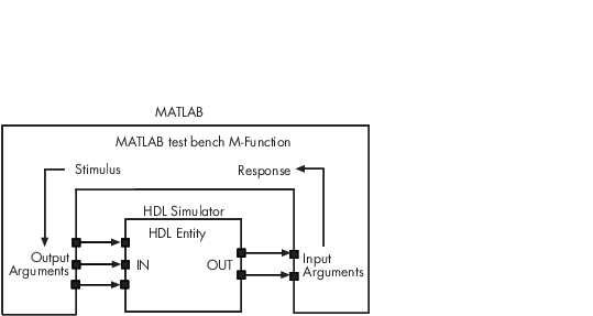 На следующем рисунке показано, как функция MATLAB охватывает имитатор HDL и взаимодействует с ним во время сеанса моделирования тестового стенда.