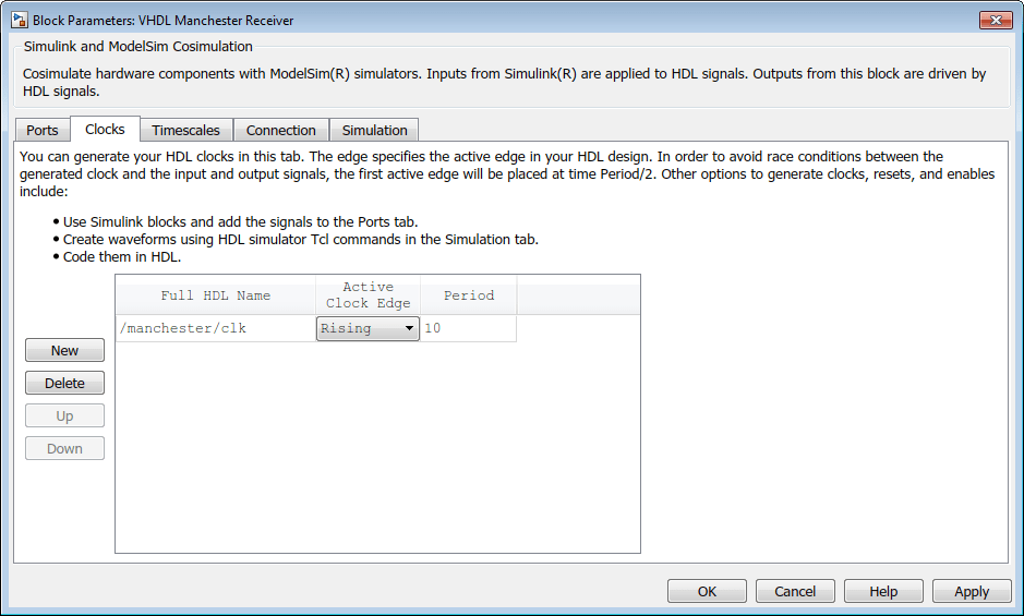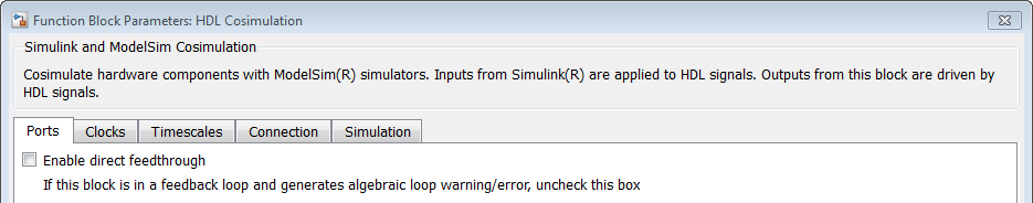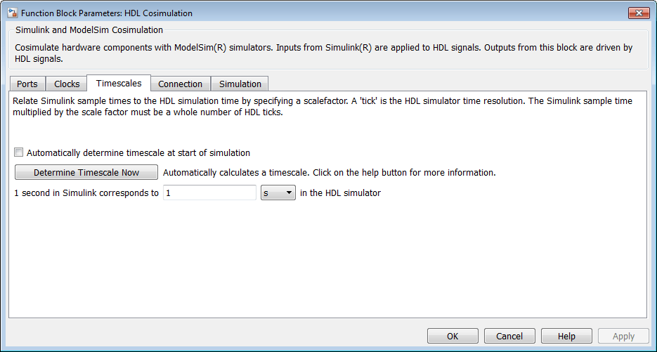 Взаимосвязь синхронизации между Simulink и имитатором HDL настраивается с помощью панели Timescales диалогового окна параметров блока. Перед установкой параметров Timescales прочитайте Simulation Timescales, чтобы понять поддерживаемые режимы синхронизации и проблемы, которые определят выбор режима синхронизации.