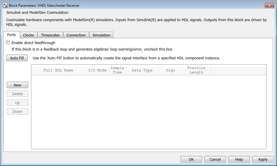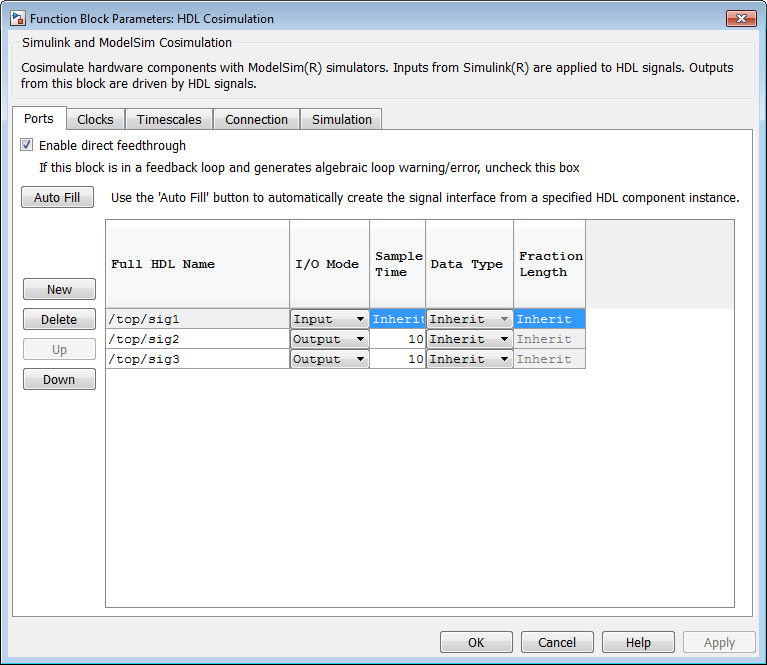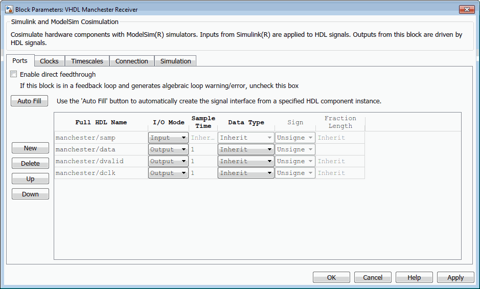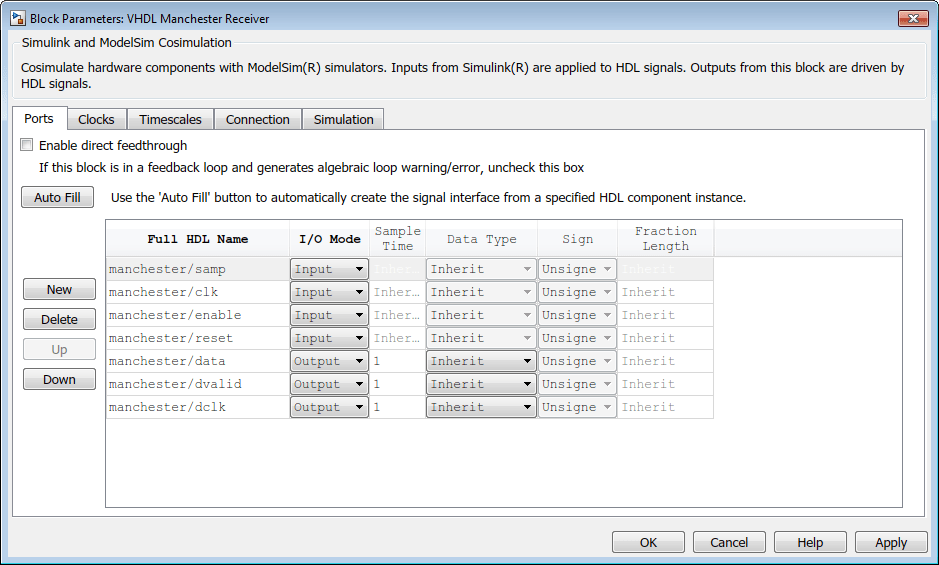 Кнопка Auto Fill используется для получения блоком Cosimulation HDL информации о сигнале путем передачи запроса в имитатор HDL. Этот подход позволяет сэкономить значительные усилия при необходимости косимуляции модели ЛПВП, имеющей множество сигналов, которые требуется подключить к модели Simulink. Однако в некоторых случаях потребуется отредактировать данные сигнала, возвращенные запросом.