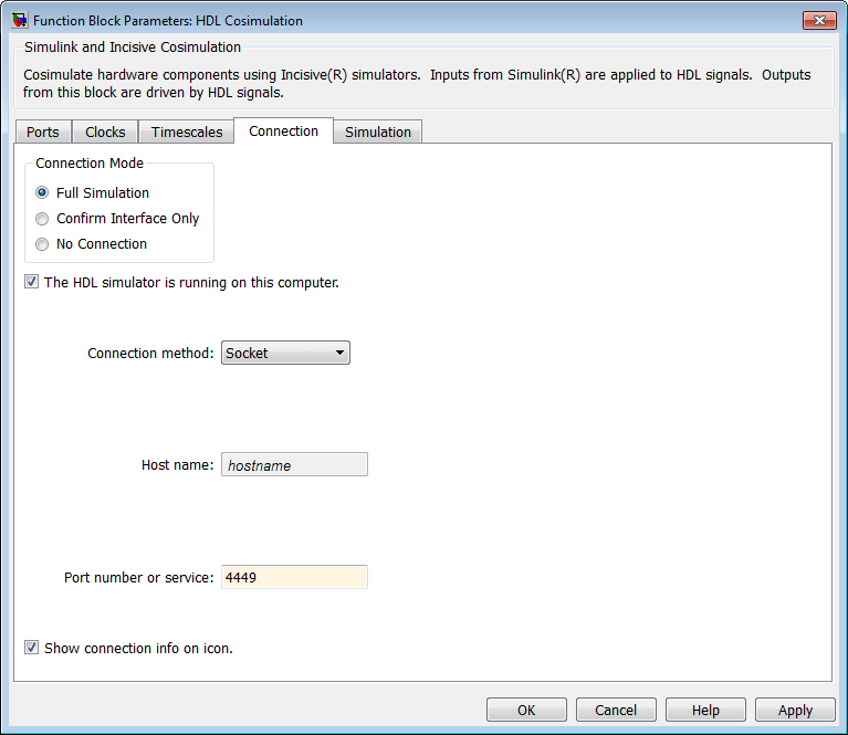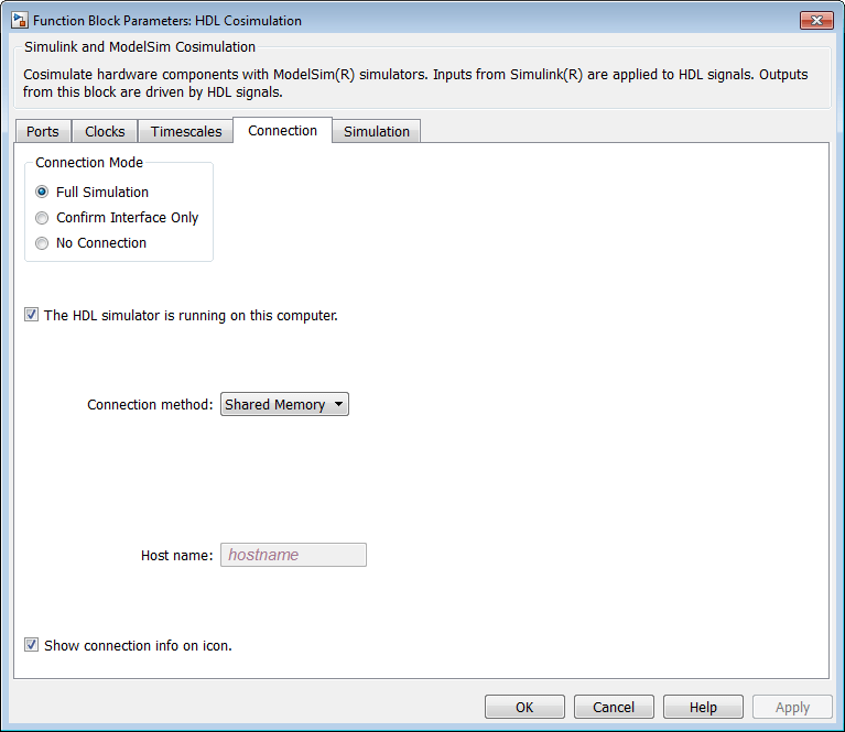 После выбора типа связи настройте канал связи блока с помощью панели Соединение (Connection) диалогового окна параметров блока (пример показан для использования с ModelSim).