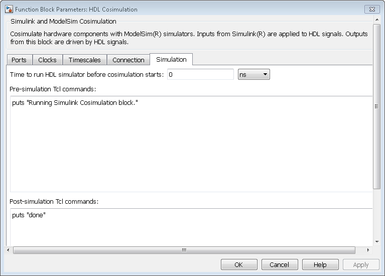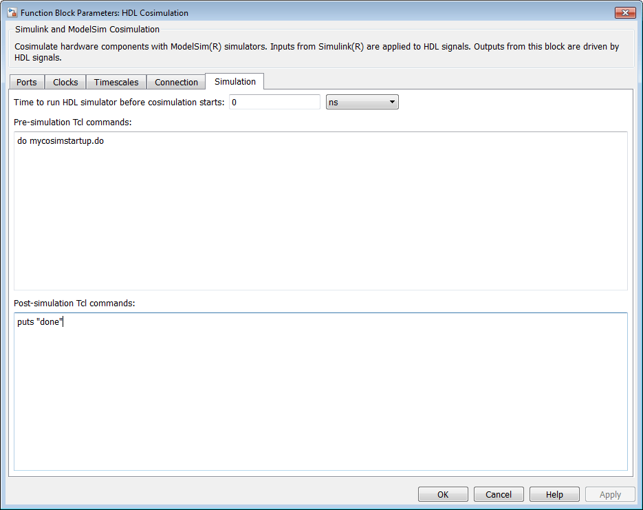 Команды Tcl, выполняемые до и после моделирования, можно задать путем ввода команд Tcl в текстовые поля команд Pre-simulation или Post-simulation на панели Simulation диалогового окна Параметры блока косимуляции HDL.