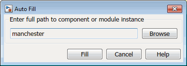 В этом примере функция автоматической заливки получает данные порта для компонента VHDL с именем manchester. Путь HDL указан как /top/manchester. Спецификации трактов будут варьироваться в зависимости от имитатора ЛПВП. См. раздел Определение трактов сигналов/портов ЛПВП и модулей для симулятора компонентов.