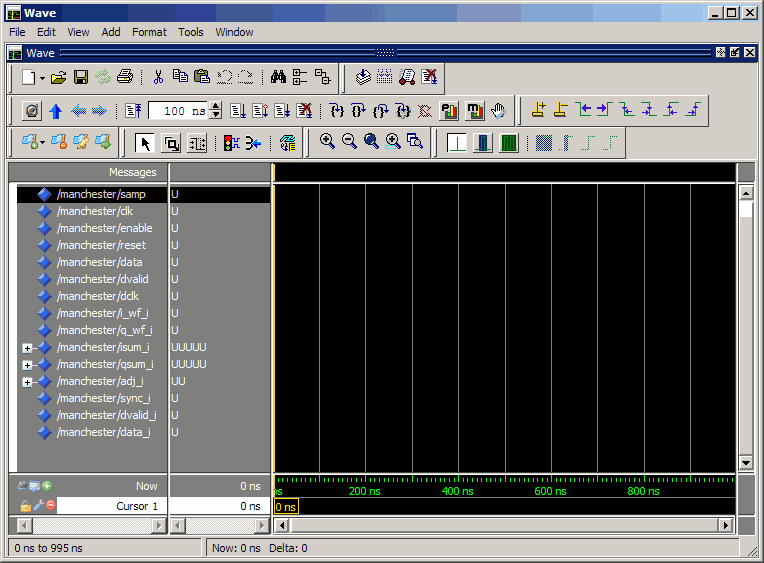 В имитаторе ЛПВП определите имена трактов сигналов ЛПВП, которые планируется определить в блоке. Например, в симуляторе ModelSim в следующем волновом окне показаны все сигналы, подчиненные модулю верхнего уровня manchester.
