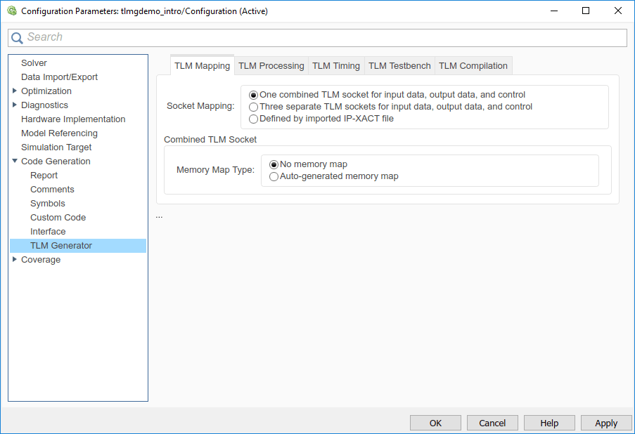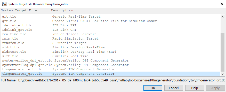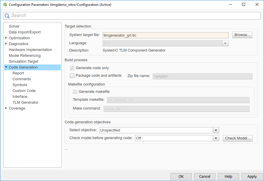 С лицензией Embedded Coder ® (также требуется лицензия Simulink Coder) выберите :tlmgenerator_ert.tlc или tlmgenerator_grt.tlc. Цель tlmgenerator_ert.tlc позволяет получить доступ к дополнительным опциям создания кода с помощью диалогового окна Параметры конфигурации модели (Model Configuration Parameters).