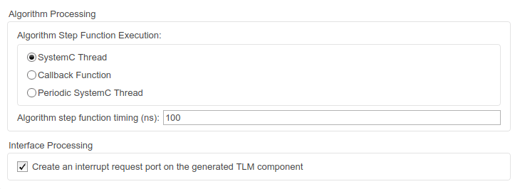 Выберите Create a interrupt request port (Создать порт запроса прерывания) в сгенерированном компоненте TLM для создания порта запроса прерывания. Это прерывание запускается каждый раз при обработке набора входных данных.