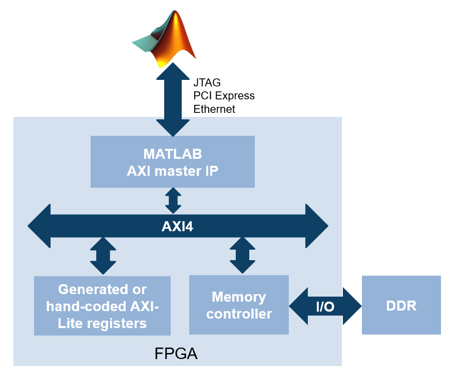 Доступ к расположениям встроенной памяти можно получить из MATLAB, используя главный IP-адрес MATLAB AXI в конструкции FPGA, а также aximaster объект. Объект подключается к IP по физическому кабелю и позволяет выполнять команды чтения и записи в подчиненные ячейки памяти из командной строки MATLAB.