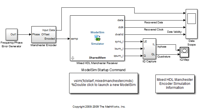 Блок косимуляции ЛВП моделирует манчестерский приемник, который кодируется в ЛВП. Другие блоки и подсистемы в модели включают в себя следующее: