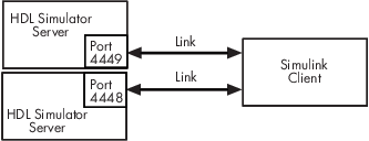 Как показано на следующем рисунке, несколько блоков косимуляции в модели Simulink могут запрашивать обслуживание нескольких экземпляров имитатора HDL, используя уникальные сокетные порты TCP/IP.