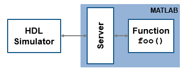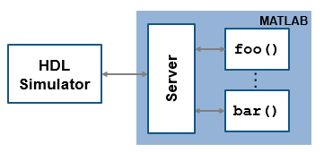 | Сеанс имитатора HDL, подключенный к функции MATLAB через один экземпляр сервера MATLAB. |