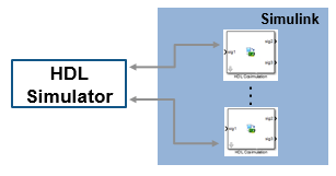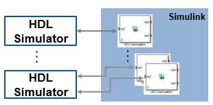 | Несколько блоков косимуляции ЛПВП в модели Simulink, подключенных к различным сеансам имитатора ЛПВП. Блоки косимуляции HDL в модели Simulink могут подключаться к одним и тем же или различным сеансам имитатора HDL. Каждый блок косимуляции ЛПВП может взаимодействовать только с одним имитатором ЛПВП. |