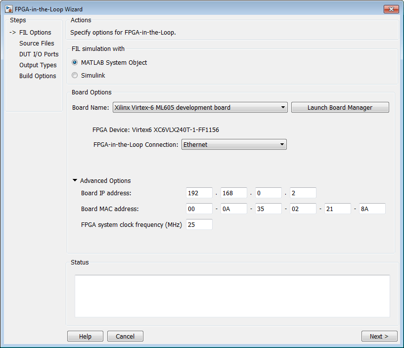 FPGA-in-the-Loop Connection: метод имитационного соединения FIL. Опции раскрывающегося меню обновляются в зависимости от методов подключения, поддерживаемых для выбранной целевой платы. Если целевая плата и HDL Verifier поддерживают подключение, можно выбрать Ethernet, JTAG, или PCI Express.